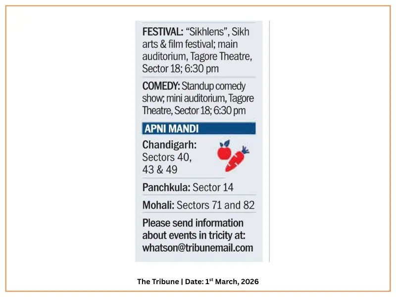 1. The Main Event: A full-day Films and Arts festival will take place at the Tagore Theatre, Sector 18, Chandigarh, on Saturday, February 28, 2026 (11 AM to 8 PM). Entry is free to the public.